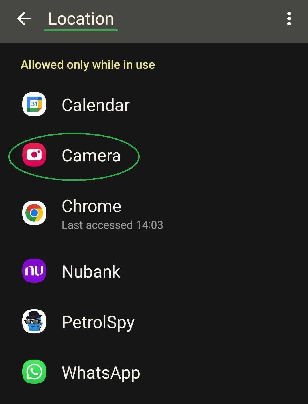 Turn the Toggle on and click on “Camera”