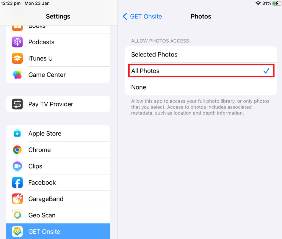 iOS users please ensure that you set your permissions to allow the Onsite app access to All Photos. If Selected Photos is selected Onsite may not sync photos correctly.