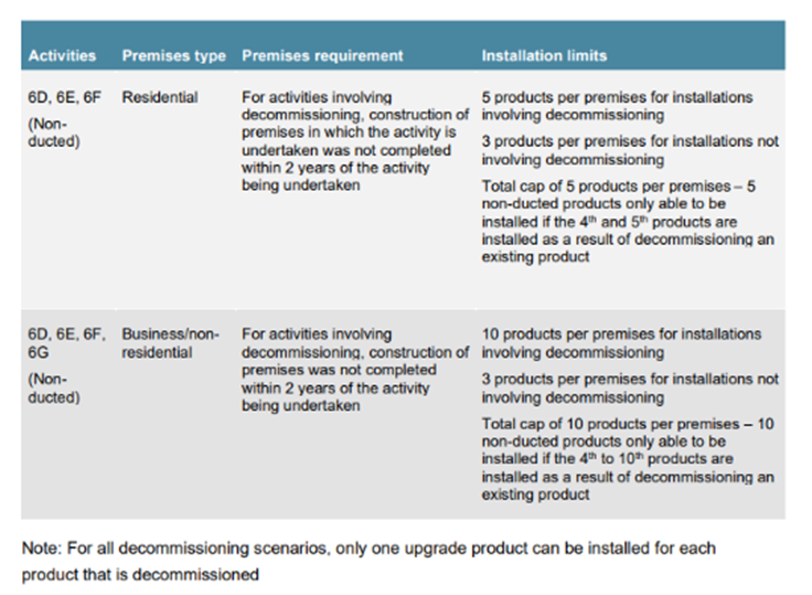 5 non-ducted installations per premises, of which up to 3 can involve no decommissioning